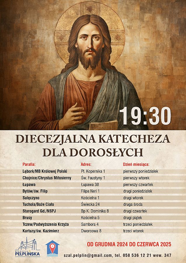 Wydział Duszpasterski Diecezji pelplińskiej zaprasza wszystkich, którzy pragną pogłębić swoją wiarę, do uczestnictwa w diecezjalnej katechezie dla dorosłych. Spotkania rozpoczynają się w naszej parafii o godzinie 19:30 w I poniedziałek miesiąca w Domu Fatimskim. Wejście od ul. J. Malczewskiego. Najbliższe spotkanie odbędzie się 6 stycznia br.