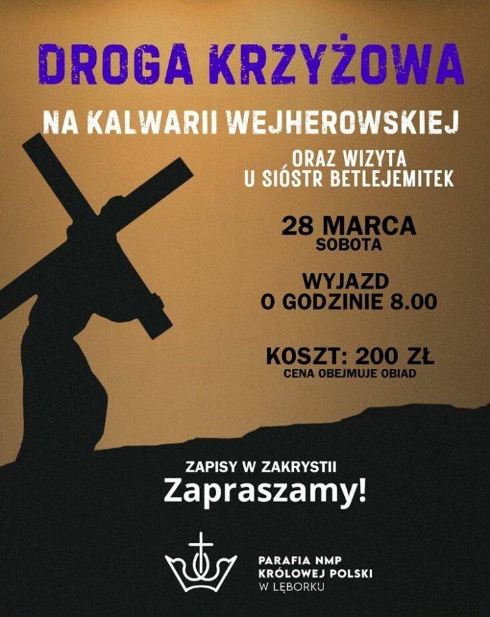 28 marca w sobotę organizujemy z naszej parafii wyjazd na Kalwarię Wejherowską. W programie, wspólna Droga Krzyżowa na Kalwarii, wizyta u sióstr Beltejemitek w Grabowcu oraz obiad. Wyjazd o godz. 8.00, powrót w godzinach popołudniowych. Koszt - 200 zł. Zapisy w zakrystii.