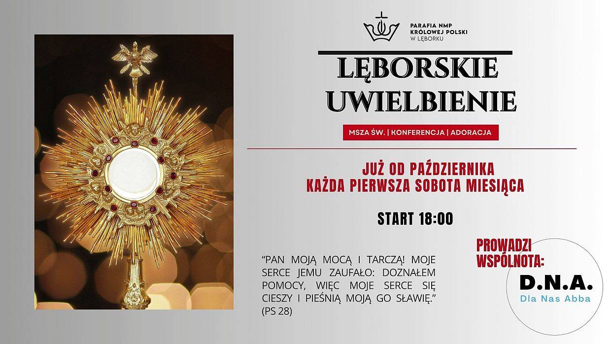 - Począwszy od października, w każdą pierwszą sobotę miesiąca – Wieczór Chwały – wspólne uwielbienie Boga modlitwą, śpiewem i radością serc.