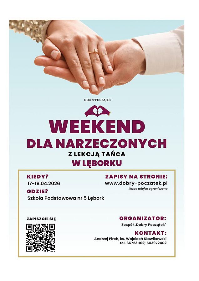 Od wtorku 17 lutego zaczynają się zapisy na Weekend dla Narzeczonych z lekcją tańca, organizowany przez naszą parafię w szkole Podstawowej nr 5 w Lęborku. Zapisy na stronie www.dobry-poczatek.pl.